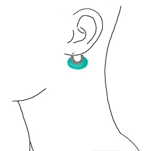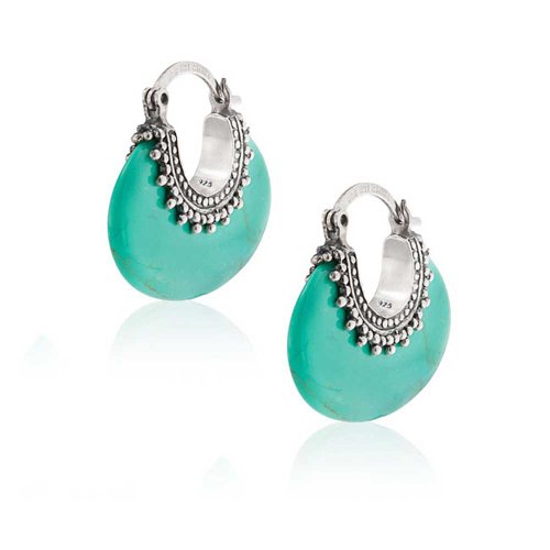 These traditional Bali style filigree hoop earrings are artistically created from solid .925 sterling silver and feature sensational rounded oval synthetic turquoise. It is designed with intricate beaded detailing that completes the earrings exotic look. These half moon hoops delicacy and elegance is reflected in their light weight and the 1 inch drop from the ear lobe. These stunning synthetic turquoise earrings feature a functional stud back closure. These sterling silver earrings emit a vibrant radiance that will make you stand out in a crowd. These synthetic turquoise hoops would look exceptionally great with a brown or white tee shirt in the summer. Come and get your beautiful hoop earrings today.Feature
