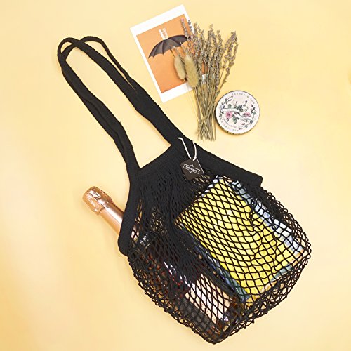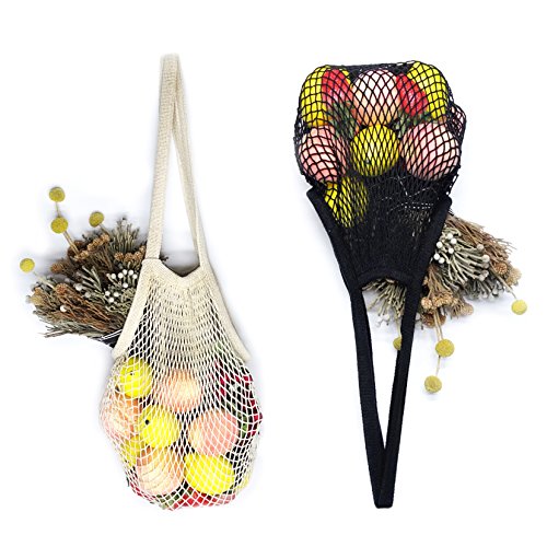 Net Shopping Bag Cotton Market String Reusable Net Shopping Tote with Long Handles Washable Mesh Fruit Vegetable Pack of 2 (Natural + Black)