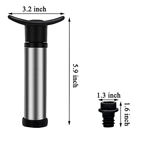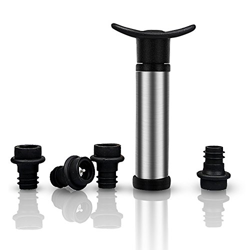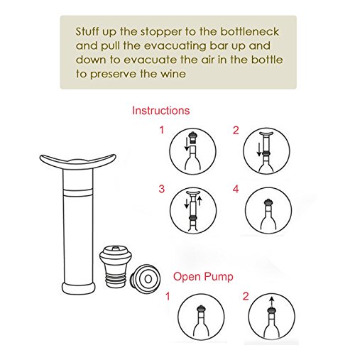 -. Feature : The BeGrit Wine Saver vacuum pump is made of sturdy strong stainless steel that can last a life time, and the pump handle is ergonomically designed for easier pumping action and designed to avoid pinching that can occur with other pumps / This BeGrit Wine Pump can help to create an airtight vacuum that preserves wine once the bottle has been opened, prevents the oxidation process that is responsible for the deterioration of wine, can keep wine fresh and tasty / This BeGrit product comes with 4 reusable bottle stoppers, you can free to enjoy kinds of wines at the same time, and do not worry about the wine go bad / Easy to Use: 1, Put the smaller side of the black bottle stopper in to the bottle mouth. 2, Use the wine saver pump to connect the stopper's other side. 3, Pumping the air out until you fell strong air resistance, then it is ok. 4, When you need to drink again, press the top of the stopper to release the pressure in the bottle / Amazing pump is pretty small in size, it is good for traveling and present as a gift, it can be used for: different events, wine tastings, festivals, wine bars, restaurants, houses etc