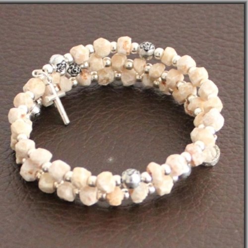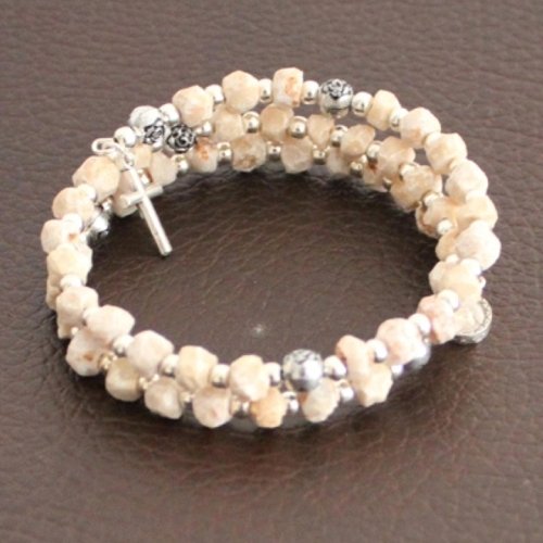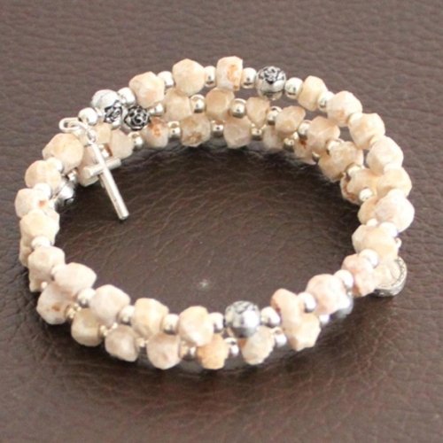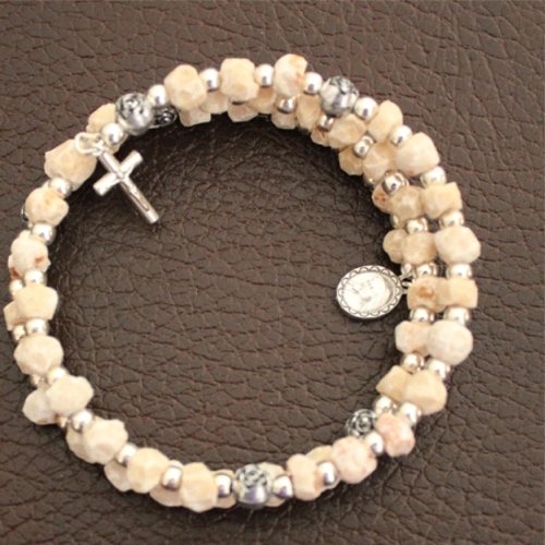Rosary Wired with thick wire to stay as bracelet, made with stones carved by hand from Apparition hill - PODBRDO MEDJUGORJE area and Silver tone beads, Crucifix and medal. Comes with gift Medugorje card. Shipped directly from Medjugorje.