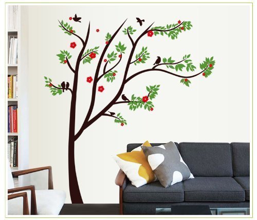 -. Title : Amaonm® Removable Tall Tree with Green Leaves Pink Red Cherry Blossom Flowers Flying Birds Wall Decal Home Art Decor Deocrations Wall Sticker Murals for Girls Bedroom Living Room