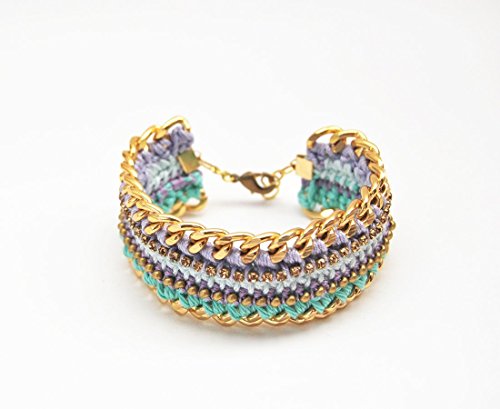-. Title : Bohemian bracelet with rhinestones and chunky chain in violet and mint