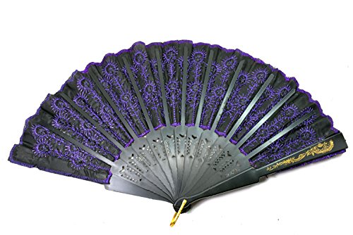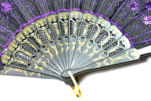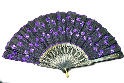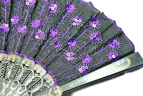 Elegant Colorful Embroidered Flower Peacock Pattern Sequin Fabric Folding Handheld Hand Fan Hand-crafted (purple)