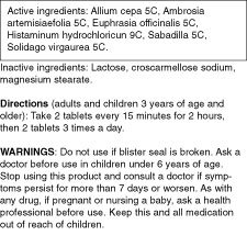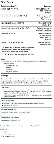 Active Ingredients Allium cepa 5C HPUS Relieves runny nose associated with allergies Ambrosia artemisiaefolia 5C HPUS Relieves spasmodic cough associated with hay fever Histaminum hydrochloricum 9C HPUS Relieves symptoms of allergic conditions Euphrasia officinalis 5C HPUS Relieves burning, irritated eyes Sabadilla 5C HPUS Relieves sneezing associated with allergies Solidago virgaurea 5C HPUS Relieves abundant nasal discharge *The letters HPUS indicate that these ingredients are officially included in the Homeopathic Pharmacopeia of the United States.