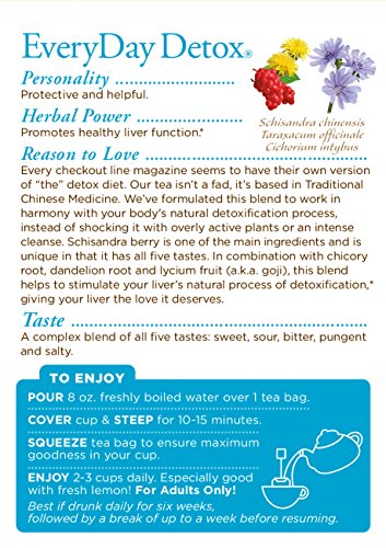 -. Feature : Promotes Healthy Liver Function* / Non-GMO verified; 85% Certified Organic Ingredients; Kosher / Herbal Supplement. The highest quality, pharmacopoeial grade herbs / Taste: A complex blend of all five tastes: sweet, sour, bitter, pungent and salty / Case of six boxes, each box containing 16 sealed tea bags (96 total tea bags)