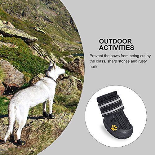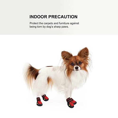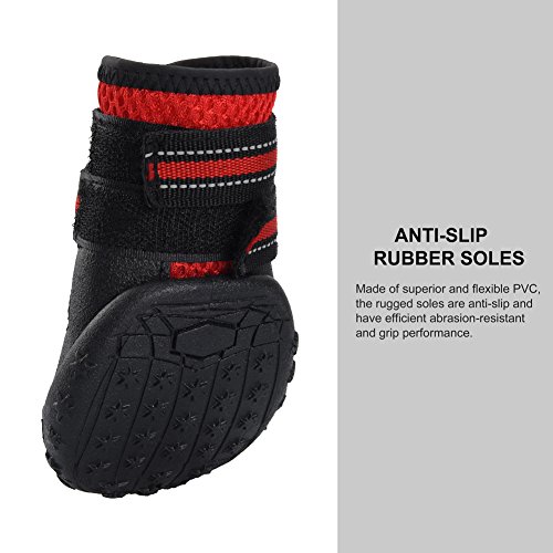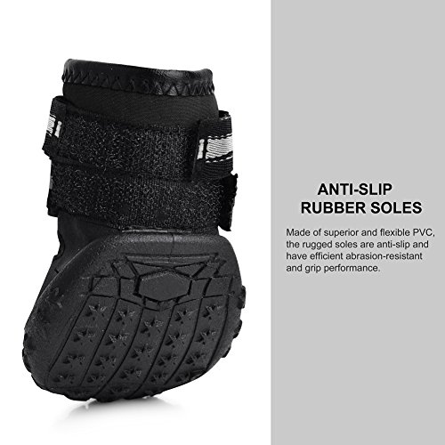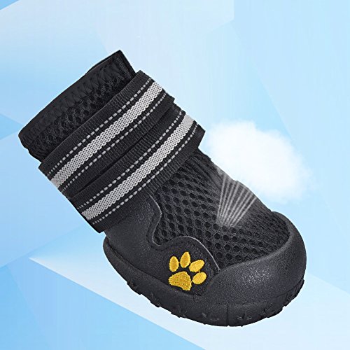 -. Feature : Made of tough and superior material, capable to keep debris out and bring comfort and cool to paws. / Flexible, anti-slip soles, well provides traction and offers all-round paw protection in wet and dry, hot and cold conditions. / Easy to put on with wide split seam top opening and reflective velcro straps, difficult to slip off, extremely safe at night. / Superior material, soft and hand washable, offer durable use experience. / With adjustable velcro, allow you to adjust the tightness for your dog, very convenient and practical.