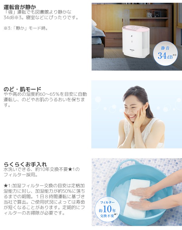 小さくてもパワフル加湿。持ち運びに便利なコンパクトモデル。本体外形寸法 高さ295×幅305×奥行き190mm 本体質量(タンク空時) 約3.1kg タンク容量 約2.1L コードの長さ 1.5m 消費電力 強50Hz:10W60Hz:11W弱50Hz:4W60Hz:5W 検索キーワード:加湿器 加湿機 加湿 潤い 乾燥 ドライ 冬 暖房 湿気