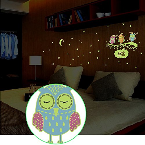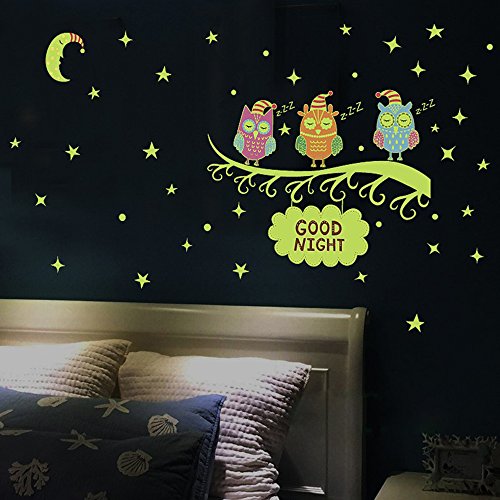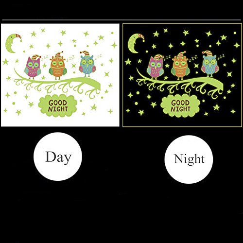 - Glow In The Dark Design:Night light moon owl wall stickers.Even in the dark night,it gives your child a mom-like sense of care,no longer lonely and afraid at night.Being exposed to sufficient light for about 5 minutes and it can continue to shine,soft green light is designed for children,no harm to their eyes.Three cute owls sleep leisurely on the branches, do you find that your child has gradually drowsiness? Wish they are in sweet dreams already