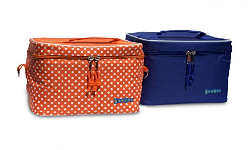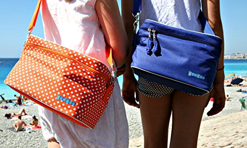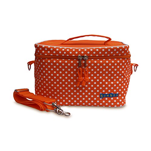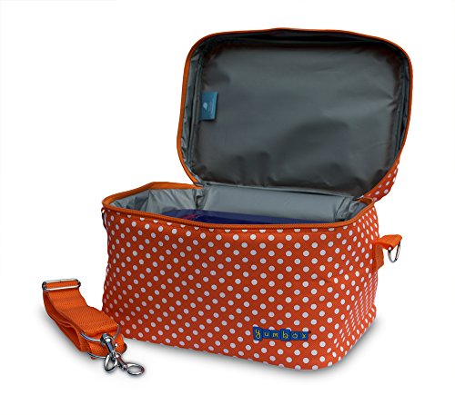 The Tango Orange with White Polka Dots Yumbox insulated lunch bag cooler is made of high quality polyester. The roomy design features a zip closure, removable shoulder strap, and top handle. The cooler is custom designed to fit the popular Yumbox bento lunch box containers upright, to preserve food presentation and to optimize meals on the go packing. The tote easily fits a Yumbox, a snack box, a drink and ice pack with room to spare. The stylish lunch cooler works well for packed lunches, snacks or to transport any type of food. It is perfect for school, work, day care, camp, picnics, and travel. Wipe clean. Use gentle soap and air dry.