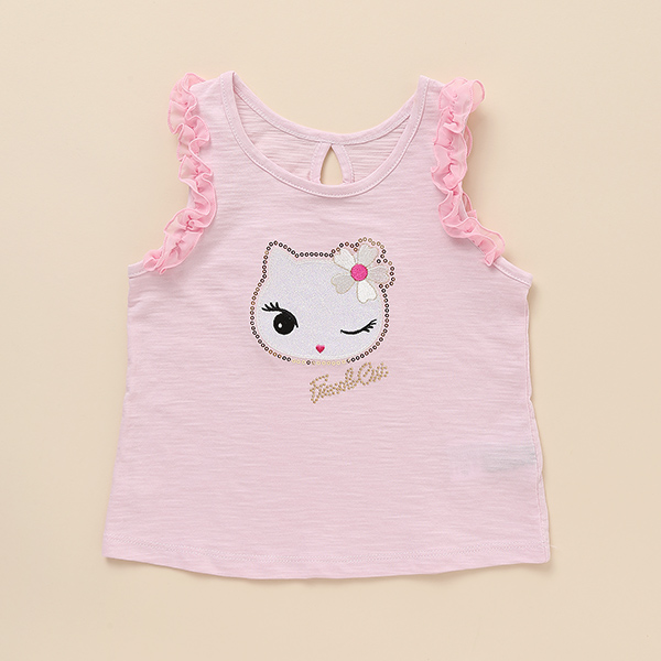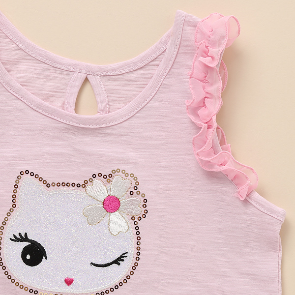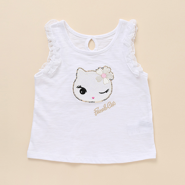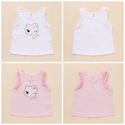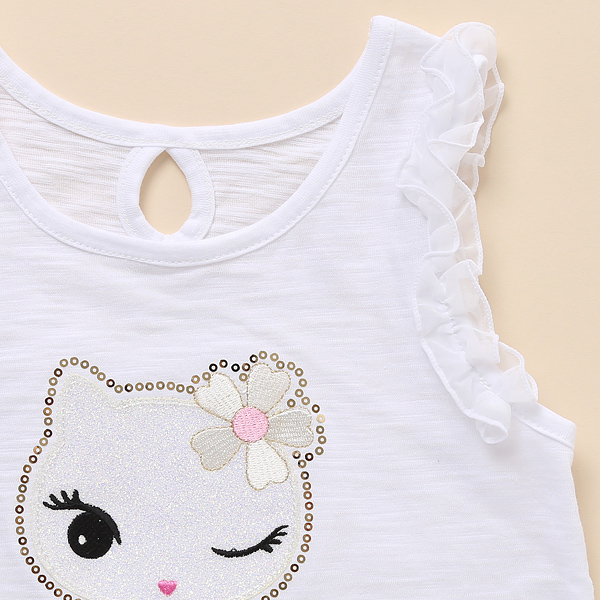 상품설명 오프 화이트 컬러의 나시 티셔츠 입니다. 시원한 슬랍 소재로 만들어져 입기 편하며 착용감 또한 편합니다. 아이들이 좋아하는 고양이 장식으로 귀여운 포인트를 주었습니다. 우븐 팬츠나 데님 팬츠, 호박바지등과 코디하시기 좋은 핫썸머 아이템입니다.