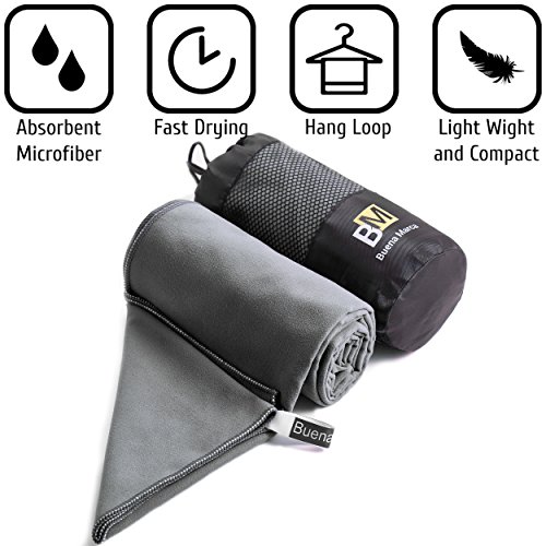 -. Feature : HIGH ABSORPTION & ULTRA-FAST DRYING - BUENA MARCA Microfiber camp towel quick dry can absorb large quantities of water quickly and. Available in different three sizes & two colors. / COMPACT, LIGHTWEIGHT AND EASY TO PACK - These quick dry towels are very compact in size, and therefore, travel-friendly for backpacking. Our Microfiber bath towels are also extremely lightweight! / HIGHLY DURABLE & EASY TO USE - With our microfiber towels, you can expect no shedding or lint. Each sports towel comes with a hang loop & can be cleaned effortlessly - safe for machine wash too! / USE IT THE WAY YOU LIKE IT - Our towels can be used as regular home, Beach, Gym, Workout, Hair, Swimmers, Sports, Running, Swimming, Wicking or Travel Towel / 100% RISK-FREE SATISFACTION GUARANTEE - It is the best microfiber towel deal in the market - buy with confidence; no questions asked, and you also get a mesh carry bag as FREE BONUS!