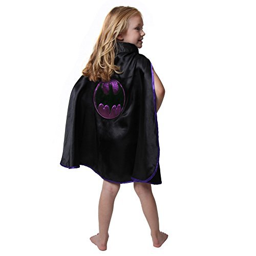 -. Binding : Toy -. Brand : Making Believe -. Color : Black/Purple -. Department : girls -. EAN : 0792125453471 -. Feature : Dressup cape for Halloween Costume or Birthday Party Favor / High quality embroidery bat emblem / Fun party favor or addition to a dress up trunk / Soft touch neck closure for adjustable fit / Cape is 24" long for ages 3 up -. IsAdultProduct : 0 -. Label : Making Believe -. Manufacturer : Making Believe -. PackageQuantity : 1 -. ProductGroup : Toy -. ProductTypeName : TOYS_AND_GAMES -. Publisher : Making Believe -. Studio : Making Believe -. Title : Kids Black & Purple Bat Cape -. UPC : 792125453471