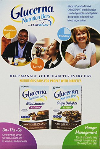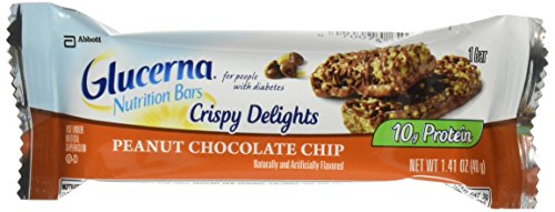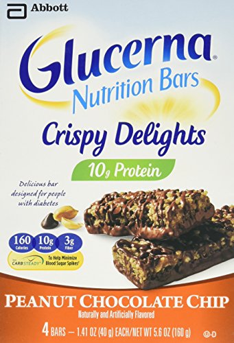 -. Binding : Health and Beauty -. Brand : Glucerna -. EAN : 0070074620770 -. Feature : Helps manage hunger as part of your diabetes weight loss plan / Has CARBSTEADY, a blend of slowly digestible carbs to help minimize blood glucose response / #1 doctor and nutritionist recommended nutritional brand for people with diabetes / 10 grams of protein to help manage hunger / Good source of fiber and an excellent source of Vitamins C and E -. IsAdultProduct : 0 -. Label : Glucerna -. Manufacturer : Glucerna -. Model : 62077 -. MPN : 62077 -. NumberOfItems : 4 -. PackageQuantity : 4 -. PartNumber : 62077 -. ProductGroup : Health and Beauty -. ProductTypeName : HEALTH_PERSONAL_CARE -. PublicationDate : 2011-08-31 -. Publisher : Glucerna -. Studio : Glucerna -. Title : Glucerna Crispy Delights Nutrition Bars, Peanut Chocolate Chip, 4 Count 1.41 oz -. UPC : 070074620770