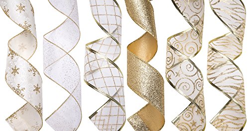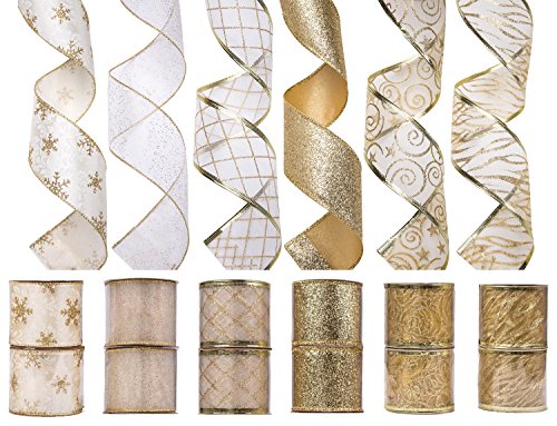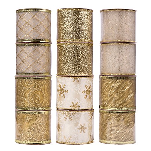 ipegtop Wired Christmas Ribbon, Assorted Shimmer Sheer Organza Glitter Gift Wrapping Ribbons Craft Wedding Decorations, 36 Yards (12 Roll x 3 yd) by 2.5 inch, White / Gold