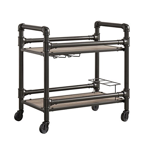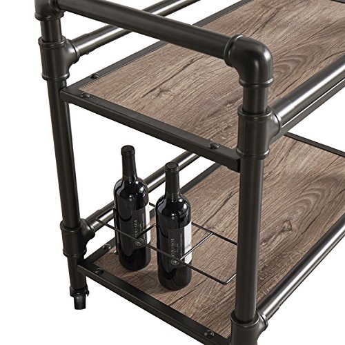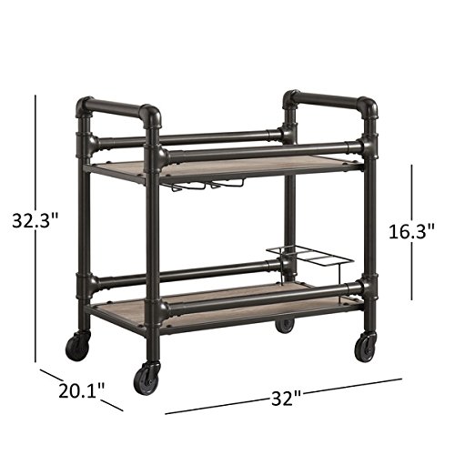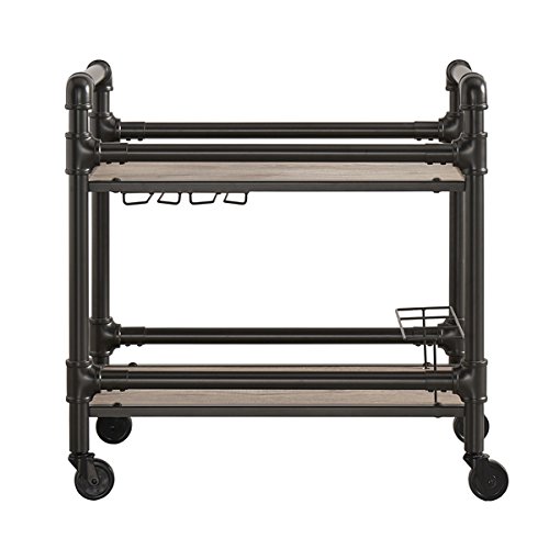 Studio : INSPIRE Q Publisher : INSPIRE Q Product Description Rustic and industrial, this unique bronze metal pipe bar cart is a style statement. Give your dining or entertainment space a vintage, eclectic flair. Featuring plenty of surface space, two hanging glass racks, and space for three bottles, all of your hosting essentials will be at your fingertips. Small enough for easy maneuverability, but large enough for pouring and mixing drinks, this convenient bar cart is a hosting essential for any occasion. 0