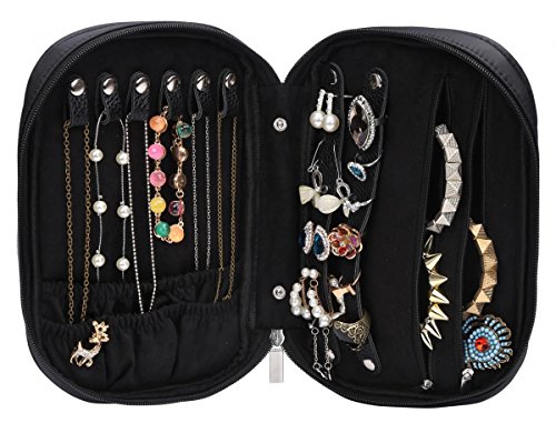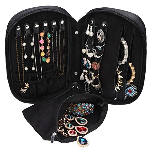 -. Feature : Exterior nylon material, making this jewelry case has a generous and elegant appearance. The interior suede material which is nice and smooth to the touch, offer the best protection to all your jewelries. / Easy to carry - Size: 9.44''L x 6.5''W, small convenient portable size, saving space for your carry-on case or lage. / 6 snaps for hanging the necklaces, keeping them from tangling. A thoughtful separated bottom pocket to protect the pendants from damage, keep them from abrasion with each other. / The removable earring strap fits 12pairs of earrings, keep them stay in a same place. One removable ring strap can hold as many as it hold, you can easily find your favorite finger accessory when you need it. / This jewelry features in two zipper pockets and one removable pouch, help to store the large pieces of jewelry. Package includes: 2pcs zipper jewelry organizer bag.