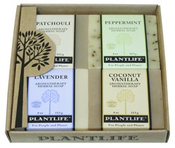 Plantlife "Earth" Aromatherapy Herbal Soap Combo contains a 4 oz bar of Patchouli, Peppermint, Lavender, and Coconut Vanilla. Soap has no harmful chemicals or additives, only natural ingredients. Made with 100% pure essential oils. Comes in a recyclable, cardboard box certified by the CFI and printed using soy ink.Feature