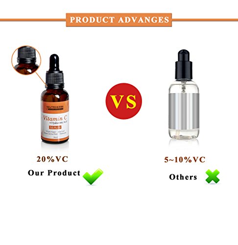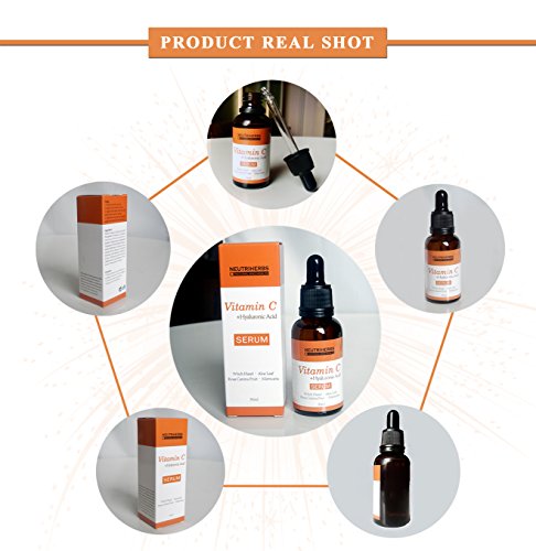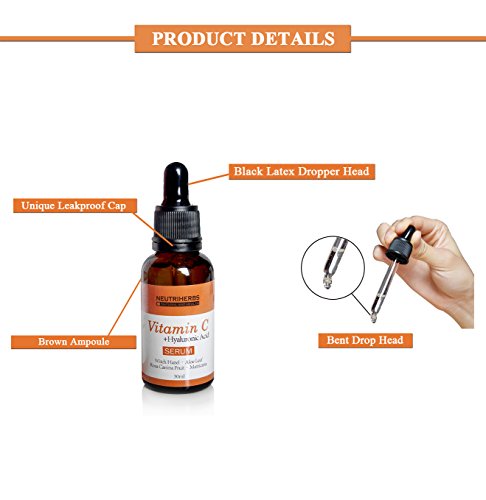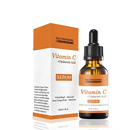 1. Description Neutriherbs Vitamin C Serum combines the highest quality Vitamin C and Hyaluronic Acid, creates a potent antioxidant effect that permeates skin smoothly and helps lighten and brighten your skin. This incredible formula fades sun spots, discoloration and refines skin texture. Leave you a youthful glow appearance.