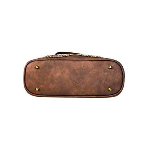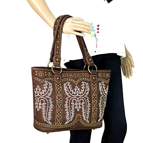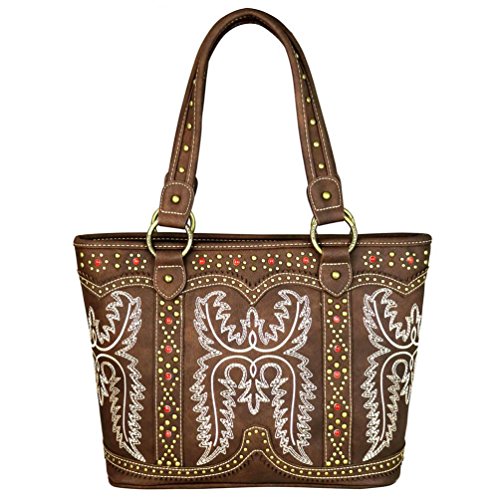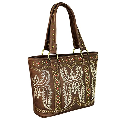 Made of coffee imitation/PU leather (distressed color), this tote bag has western embroidered pattern accented with antique goldtone and coral stone studs on the front