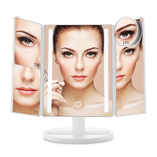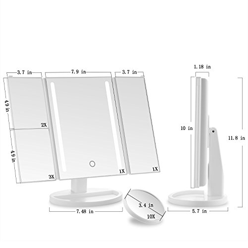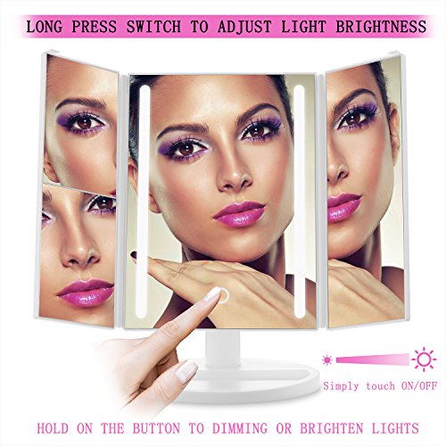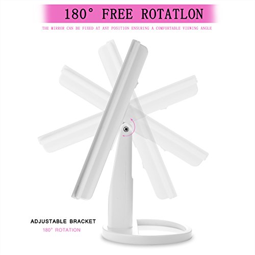 180-Degree Free Rotation & Tri-fold: The LED mirror can tilt to achieve desired angle.Tri-folding provide a wide-angle viewing of your face and protect the beauty mirrors from dusty and scratch.And small storage tray for your eye liner or lipstick for quick fixes.