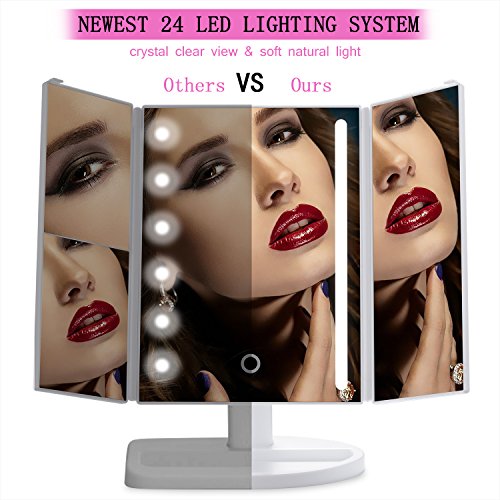 E-SDS Lighted Makeup Mirror with 24 LED Lights,10X/3X/2X/1X Magnifying Mirror,Touch Sensor Control,Dual Power Supply,180°Adjustable Stand Desk Trifold Vanity Mirror