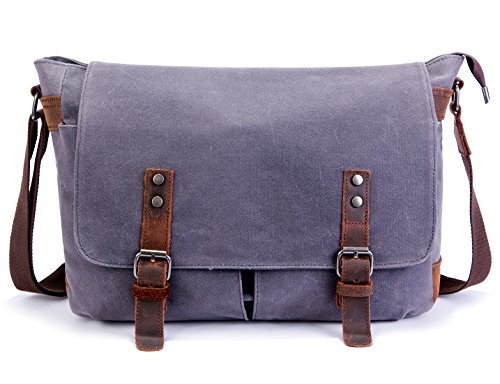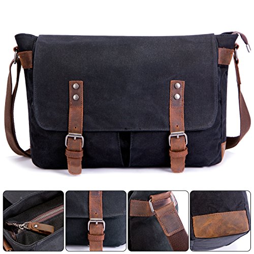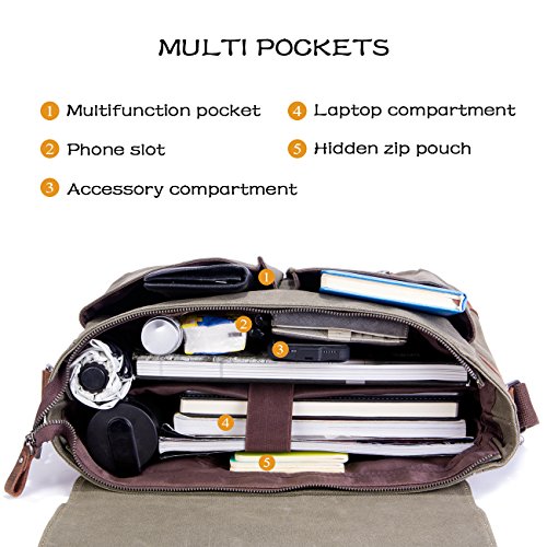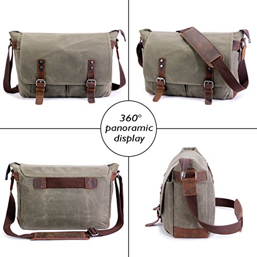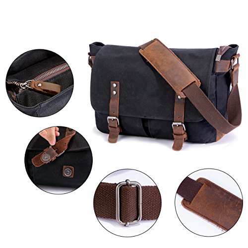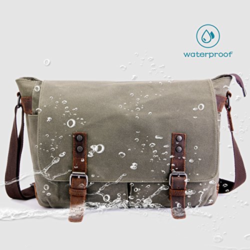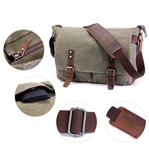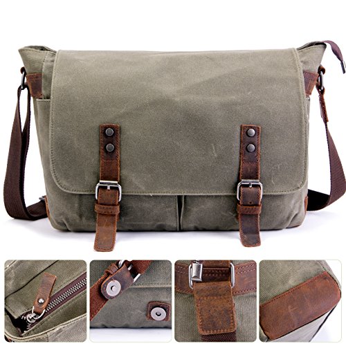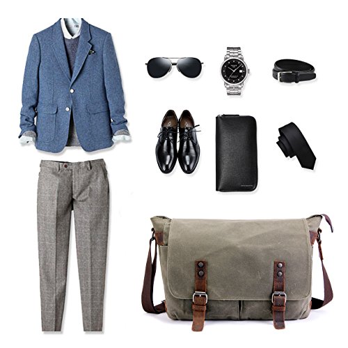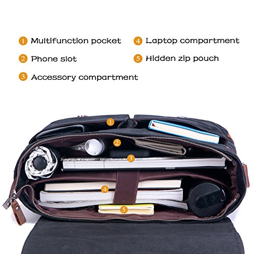 -. Feature : 【WATERPROOF DURABLE CANVAS MESSENGER BAG】 The material of this shoulder laptop bags is made up of thick and water-resistant waxed canvas, which ensure its durability (doesn't become distorted easily) and ensure that your stuff on the bag would not get wet because of the sudden rain or snow / 【ROOMY SPACE WITH PLENTY OF POCKETS】 Our briefcase shoulder bag provides great organization with the two outside pockets and three inside pockets. On one hand, the inner compartments with Zip made it easy to store key chains, wallets, cellphone or other valuable items as well as stationaries. On the other hand, exterior pocket on the back side is convenient for quickly slipping papers and such in, or retrieving them.(Can fit for 14 inches laptop) / 【PADDED SHOULDER STRAP】 Laptop messenger bag with padded strap, allow you to adjust the height, which made you comfortable even carry for a long time. If you don't want to carry by shoulder or cross body, you can attach to your rolling lage during your trip / 【EXQUISITE DETAILS】 There are great magnetic clip on the front buttons of the briefcase that can makes it easily open and close. In addition, the padded shoulder strap and buckle strap are made up of superior cowhide crazy horse leather (real leather, not cheap PU leather) / 【STYLISH MESSENGER BAG FOR MEN】 Standing for urban old fashion icon and vintage out-looking made it looks clean, simple and stylish. If you are looking for a great bag for your laptop while traveling or just need a smart bag with you when keeping your paperwork or books together and protected, this fashion laptop shoulder bag is absolutely suitable for you(also a nice gift for your father)