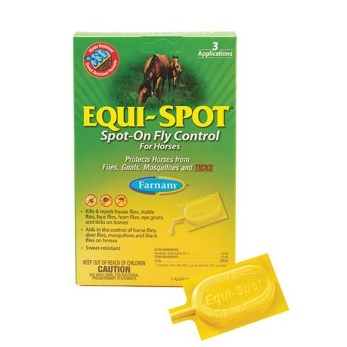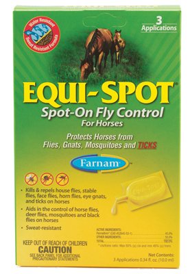 Studio : Farnam Companies Inc Publisher : Farnam Companies Inc Binding : Misc. Product Description EQUI SPOT FLY CONTROLSpot-on fly control for horses.Kills and repels house flies stable flies horn flies eye gnats and ticks.Helps control horse flies deer flies mosquitoes and black flies (3 tubes to a pack)/don t let product get in eyes or muco.Do not use on horses under 12 weeks of age.Usage:1 tube(10.0ml) .Ml along back line to base of tail.UPC : 086621025974Length : 12Width : 4.5Height : 7.75Product Type : Equine Fly Control - Fly Insect Control / Spot OnsShipping Dimensions: 12x4.5x7.75 0
