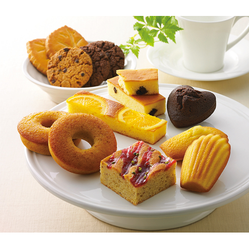 ●リーフクッキー・チョコチップクッキープレーン×各4、ハートのガトーショコラ・ラズベリーケーキ×各3、マドレーヌ・リングケーキ・オレンジケーキ・スフレチーズケーキ・チョコチップクッキーココア×各2