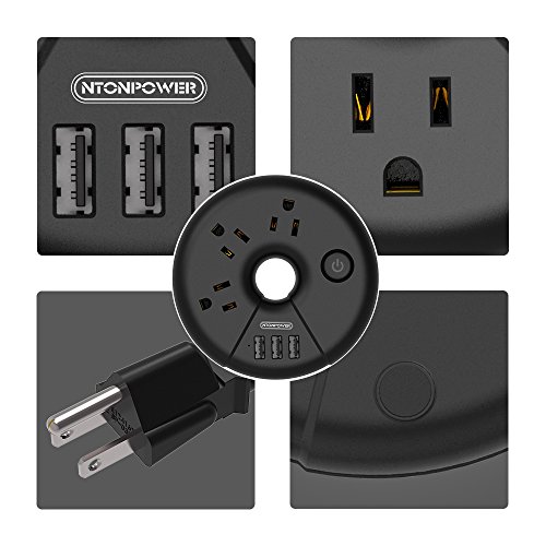 NTONPOWER Portable Power Strip with 3 USB 3 Outlets Round Donut Design Slim Size with Short Wrapped Extension Cord (15 inch) No Surge Protector for Travel, Business Trip, Cruise Ship and Hotel-Black