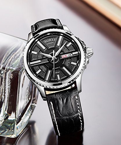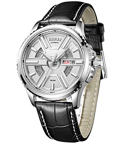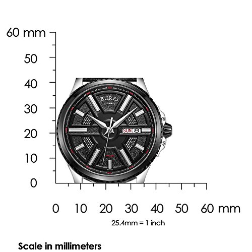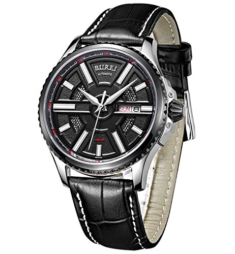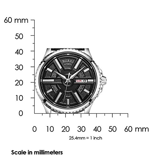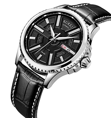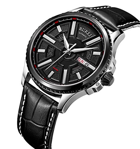 -. Title : BUREI Men's Stainless Steel Automatic Skeleton Wrist Watch with Black Leather Strap and Quartz Dial
