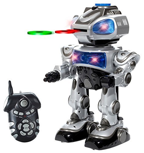 Looking for a little high-tech security around the house? The Disc-Shooting Robot walks, turns, moves its head and fires foam discs from its mouth. Simply load the included foam discs into the top of his head and you're ready for action. This battlin' bot has flashing LEDs and exciting sound effects that will have other toys running for the hills. You can control each move manually, program up to 12 actions in a row, or select automatic fight or dance modes. Ages 8+.Feature