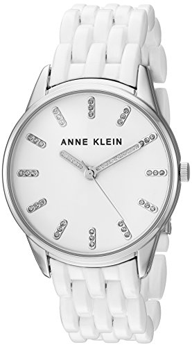 -. Binding : Watch -. Brand : Anne Klein -. Color : White/Silver -. Department : womens -. EAN : 0086702597086 -. Feature : Domed mineral crystal lens; glossy white dial with glitter filled silver-tone hands and markers / White resin adjustable link bracelet; fold over clasp with double push-button safety / Japanese-quartz Movement / Case Diameter: 36mm / Water resistant to 30m (100ft): in general, withstands splashes or brief immersion in water, but not suitable for swimming or bathing -. Label : AK Anne Klein -. Manufacturer : AK Anne Klein -. Model : AK/2617WTSV -. MPN : AK/2617WTSV -. PartNumber : AK/2617WTSV -. ProductGroup : Watch -. ProductTypeName : WATCH -. Publisher : AK Anne Klein -. Studio : AK Anne Klein -. Title : Anne Klein Women's Quartz Metal and Resin Dress Watch, Color:White (Model: AK/2617WTSV) -. UPC : 086702597086