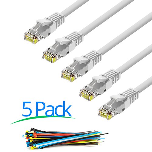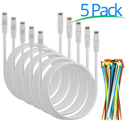Cat6 Ethernet Cable – 6 Feet Cord - 5 Pack - Internet RJ45 Gigabit Cat6e Lan Cable With Snagless Connectors For Fast Network & Computer Networking + Cable Ties - White