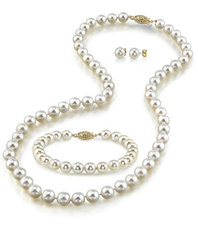 -. Title : 14K Gold 9-10mm White Freshwater Cultured Pearl Necklace, Bracelet & Earrings Set, 18" - AAAA Quality