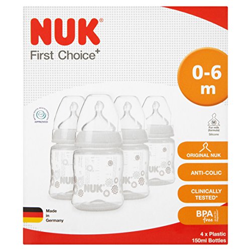 -. Binding : Baby Product -. Brand : NUK -. EAN : 0709102208184 -. Feature : NUK First Choice+ Bottles feature the original NUK orthodontic shaped teat with a special, super soft zone which adapts perfectly to baby's palate / The teat has an extra wide lip support which simulates breast feeding as closely as possible and the improved NUK Anti-Colic Air System minimises infant colic caused by the harmful swallowing of air, this also helps prevent the teat from collapsing / NUK First Choice+ Bottles are compatible with all First Choice and First Choice+ Teats / • 4 x 150ml bottle fitted with a First Choice+ Size 1 (0-6 months) Silicone Medium Feed Hole Teat and a sealing disc for leak-proof transportation / • Approved by the British Dental Health Foundation -. Label : NUK -. Manufacturer : NUK -. Model : 10743490 -. MPN : 10743490 -. PackageQuantity : 2 -. PartNumber : 10743490 -. ProductGroup : Baby Product -. ProductTypeName : BABY_PRODUCT -. Publisher : NUK -. Studio : NUK -. Title : NUK First Choice with Fireworks Bottle Silicone Teat (150 ml, Pack of 4) -. UPC : 709102208184
