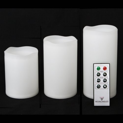 Enjoy candles outdoors with these innovative weatherproof resin candles. The weatherproof Mooncandles can be used indoors or outdoors. Enjoy candles without the messy wax and dangerous flames as well as the convenience of the remote control and timer. Flameless candles are safe to use with children and pets as well as near curtains, beds and other home furnishings. The remote control lets you use the flameless candles in hard to reach areas such as tall shelves or even chandeliers.Feature