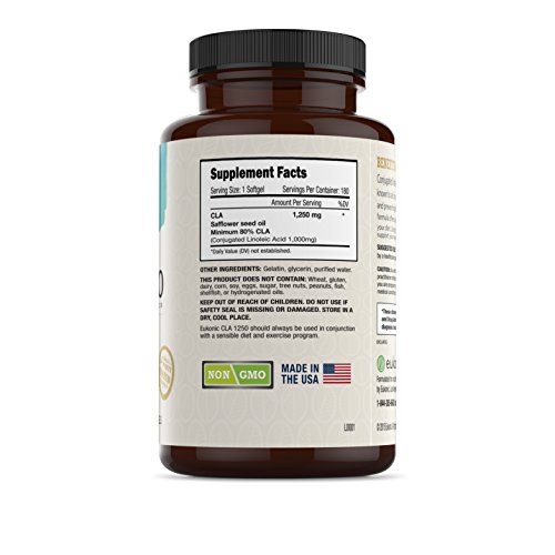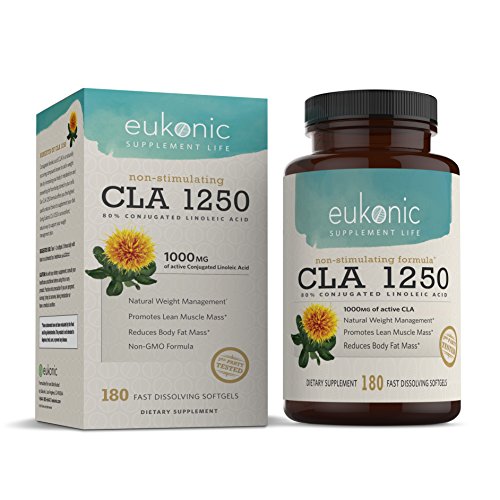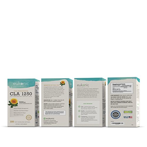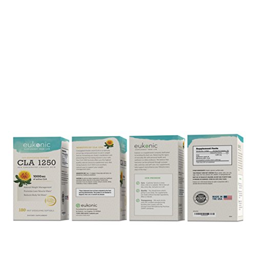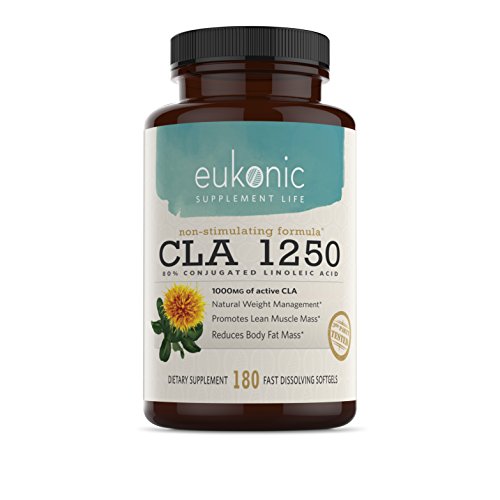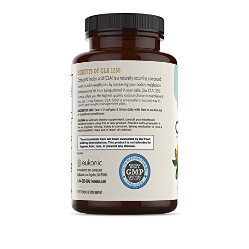 -. Feature : NATURAL, EFFECTIVE SUPPLEMENTS FOR THE BEST WEIGHT LOSS: CLA is the Perfect Aid to Weight Loss, Fitness, and Nutrition. CLA Boosts your Metabolism and Helps you Burn more Fat, while Increasing your Body's Lean Muscle. CLA Makes your Exercise and Diet More Effective by Increasing Exercise Endurance and Muscle Strength. Lose Weight Faster! / WHAT IS CLA?: Conjugated Linoleic Acid (CLA) is a Naturally Occuring Fatty Acid Found in Meats, Dairy, and Some Plants. The Maximum Strength CLA in Eukonic Supplements are Made from Pure Safflower Oil, Offering you the Highest Quality Natural Choice. Each 1250mg Softgel is Standardized to 80% CLA, for 1000mg of Active CLA. / HOW DOES CLA WORK?: CLA Helps to Decrease Body Fat in a Few Ways. It Boosts your Basal Metabolic Rate so your Body can Convert Food into Energy More Efficiently. It also Blocks Fat from Being Stored in your Cells, and Helps to Burn More of the Fat Already There. The End Result is Decreased Body Fat and Increased Lean Muscle. Multiple Clinical Studies have Shown that CLA is Effective in Reducing Body Fat and Increasing Lean Muscle. / WHY EUKONIC SUPPLEMENTS: Eukonic Is Committed To Bringing You The Finest Quality Supplements. We Are Dedicated to Helping The World Achieve And Sustain Health And Wellness Goals Through The Use Of Certified, High Quality Products. We Back Up Our Products With a 100% Money Back Guarantee. / QUALITY GUARANTEE: Purest Grade And Gluten Free, Formulated Without Preservatives, Soy, Artificial Colorings Or Stearates. Non-GMO. Packaged In The USA in a GMP & NSF Certified Facility. 3rd Party Tested. No Matter What -100% Money Back Guarantee. Made With P.R.Ide In The USA