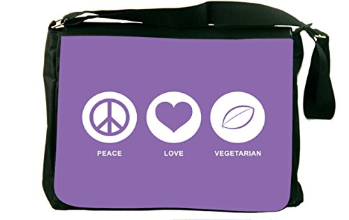 Studio : Rikki Knight LLC Publisher : Rikki Knight LLC Binding : Office Product Product Description Whether from home to the office, on a business trip or to school, the Peace Love Vegetarian Violet color laptop bag notebook bag messenger bag school bag keeps you comfortable and your cargo safe and sound - this bag features pockets on the outside below the flap for your cellphone, pens, iPod, notebook etc. And also a zippered compartment on the inside, with plenty of space to store your textbooks, folders, files, etc. And up to a 14 inch laptop (laptop sleeve sold separately) - the vibrant image on the front is professionally printed and will not fade or peel with time and this bag will surely be an eye catcher wherever you go with it. Disclaimer: all images are printed directly into the material - the Texture of the image will always be a flat surface. Any images that appears to be 3D, textured, or glittery are flat printed images. 0