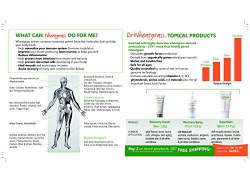 -. Feature : Enriched with highly bioactive wheatgrass-derived antioxidants; Stimulates growth factor production which can help treating various conditions- Fissure, Hemorrhoids, Molluscum, Eczema, Dry and Damaged Skin / Invented by a medical doctor and quality-controlled by state-of-the-art human genome technology / Natural - our wheatgrass extract is derived from fresh, vital, organically grown wheatgrass sprouts. / Contains naturally occurring vitamins A, C & E, phytosterols, amino acids and minerals plus the all-important Grass Juice Factor. / Safe - for children, the elderly and infirm, during pregnancy, breastfeeding and those trying to conceive.