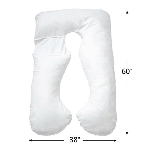Product Description ● Women who are pregnant can finally get a great night of sleep with the U Shaped Premium Contoured Body Pregnancy Pillow. Pregnant women who struggle to find a comfortable position will love this pillow. The U Shaped Premium Contoured Body Pillow provides support for the back and belly at the same time. This pillow has two contoured "legs" allowing you to sleep on your back or either side. The inner contours are designed to follow the natural curved shape of your body helping to relieve the added pressure of a pregnant belly. The pillow can also be tucked between your knees, used to elevate your head, and align your hips to help relieve strain on joints. ● Removable Zippered Pillowcase ● Unique design and shape supports back and belly. ● Size: 60' in L x 38' in W x 7' in H ● 100% Cotton Cover ● UNIQUE DESIGN ERGONOMICAL - Super soft pregnancy body pillow lets you get a good night of sleep throughout your pregnancy. The uniquely designed to follow the natural shape of the pregnancy mom, oversized U-shaped pillow, long enough for you to stretch out and support both sides of your body ● PAIN RELIEF FOR A COMFORTABLE NIGHT SLEEP - Customers have used this pillow effectively for pregnancy support, nursing and for drug free pain relief and comfort (whilst sleeping) for people with fibromyalgia, sciatica, gastric reflux, congestion, carpal tunnel syndrome, eliminate tossing and turning, ME etc. As well as helps support back, belly, sides, head, knees and feet ● VERSATILE PRODUCT MULTI-FUNCTIONAL - The maternity body pillow creates a comfortable position when sleeping, reading, nursing, watching TV. 360° Total Body Support for a painless and sound sleep ● EXCELLENT QUALITY - Cover: 100% pure cotton; pregnancy body pillow filling: polyester, which offers long lasting resilience and durability. The machine washable cotton percale pillowcase comes with a zipper for easy removal and cleaning ● Color: White ● Shape: U 0