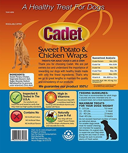 -. Feature : 3 Packages of Cadet Chicken & Sweet Potato Dog Treat Wraps; 28 oz Each / Inspected and independently tested in the USA / High in vitamins and Naturally low in fat / Contains no artificial colors, fillers, or flavors / Treats for adult dogs over 5 lbs.