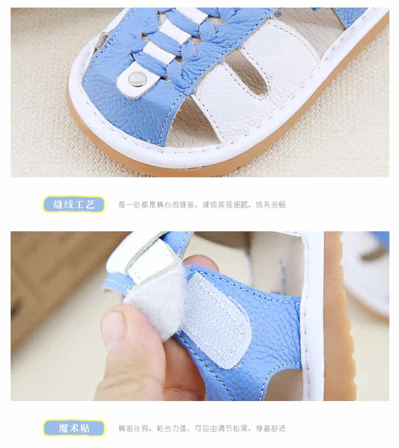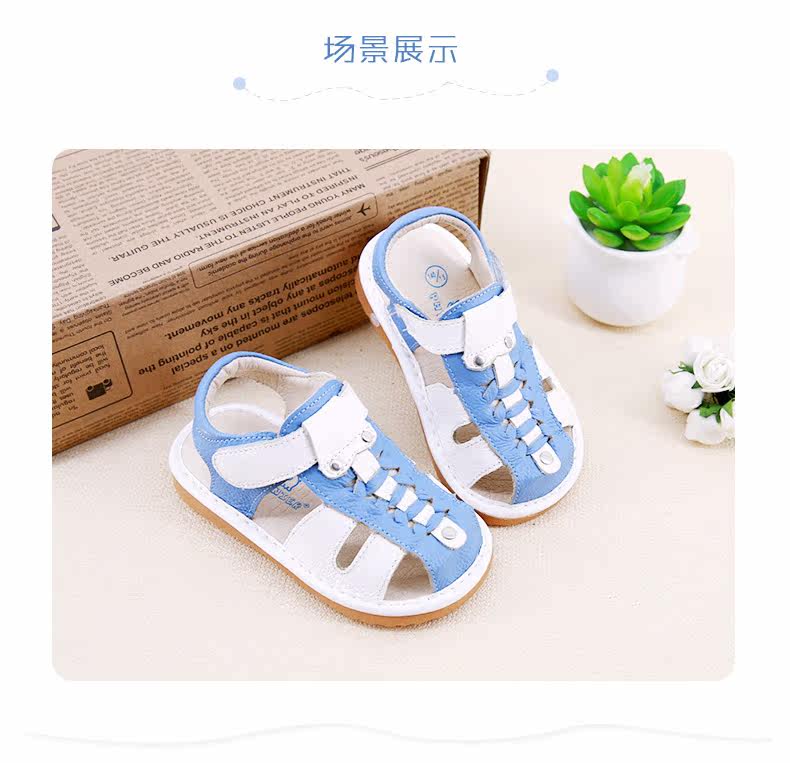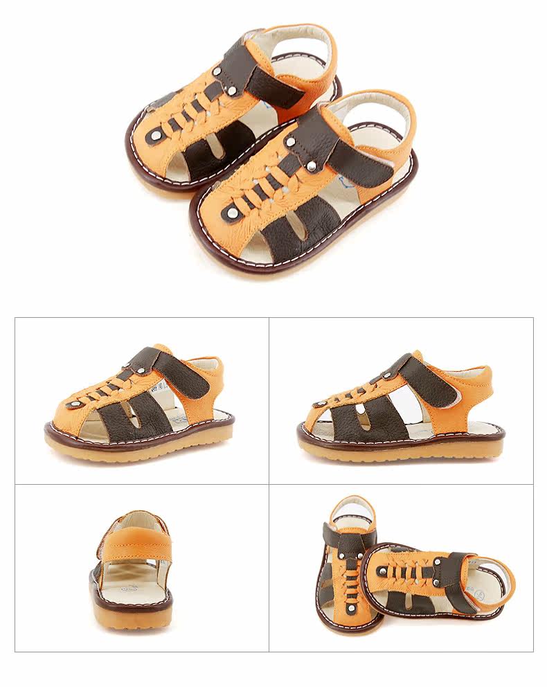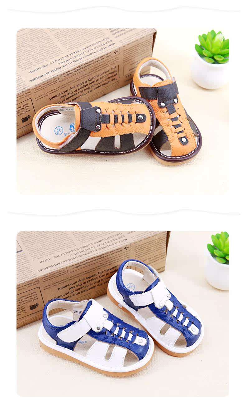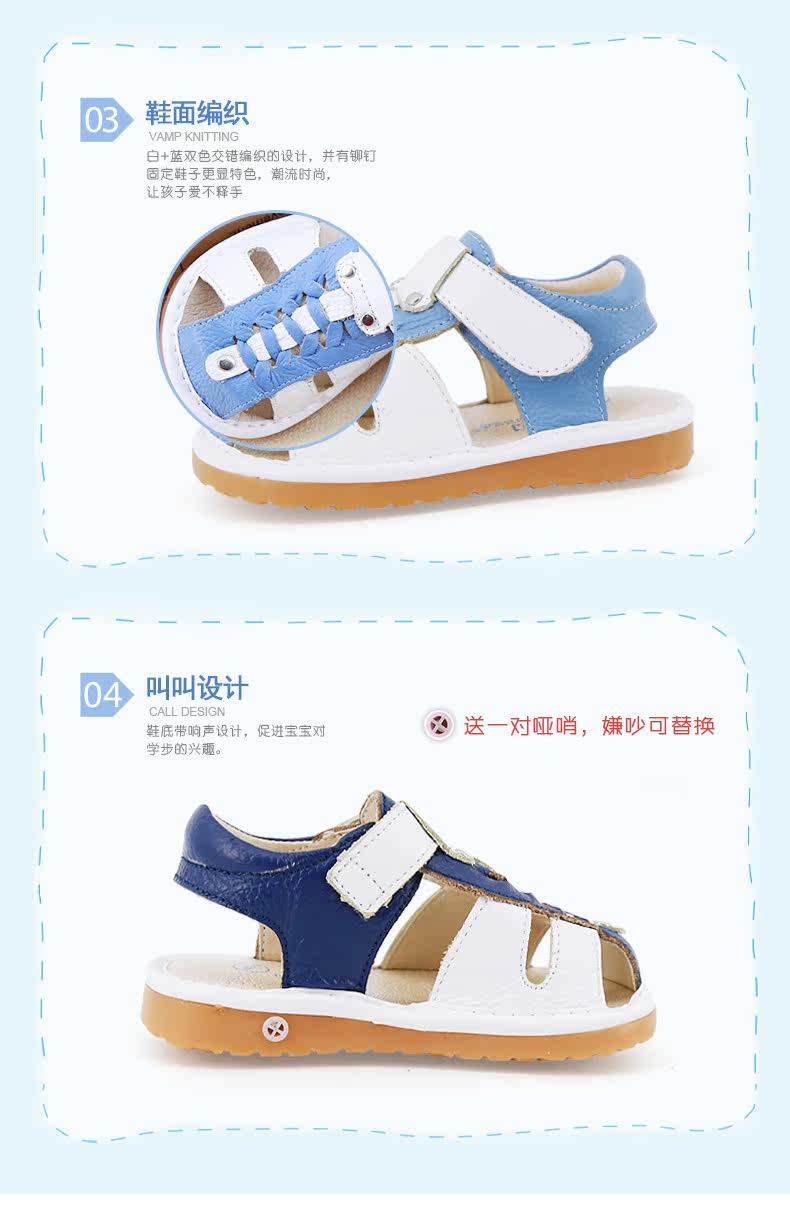 夏季新款男宝宝学步鞋包头凉鞋牛皮编织凉鞋男童叫叫鞋