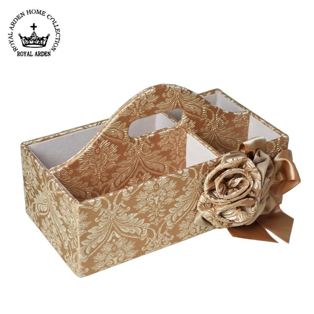 ボリュームのある豪華なコサージュがワンポイント☆仕切り付きなので、リモコンや小物を分けて収納することができ、テーブルの上もすっきり♪ 製造国:中国 素材・材質:ポリエステル100% 商品サイズ:W26×D16.5×H16cm ※サプライヤー直送品 ご注文後5~6営業日後の出荷となります【商品名】ロイヤルアーデン リモコンラック アクアフラワー ゴールデンイエロー 77901