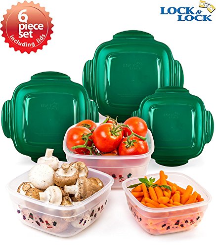 Lock & Lock 6pcs Set Square Plastic Food Storage Container Emerald Mitten Pattern with Nesting Design and Airtight Anti-Spill Proof Technology