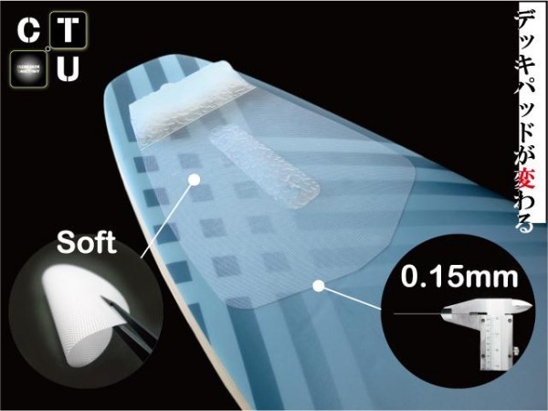 これまでのクリアデッキ同様に素材はEVAで出来ており、強力なグリップ力に加え、軽さと透明度を実現しました。CTUは水を吸わない素材なので、海に入っても重さが変わらず、安定したサーフィンが可能になります。また全体的に適度な柔軟性を持たせ、過度の衝撃を吸収できる構造。フラットシート部分の厚さは髪の毛程度のわずか0.15mm。そこからはボードとの一体感が生まれ、板本来のポテンシャルを最大限に引き出すことが出来るでしょう。 (メーカー比)