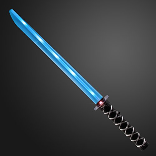 The Deluxe Ninja LED Sword is the perfect sword for a modern Ninja Samurai Warrior! The handle is silver and black and the blade is a transparent blue plastic. Use this amazing LED sword at your next party. It is the perfect accessory to light up a costume. With the push of a button, the sword is activated and the blade will light up blue while two LEDs at the top of the handle will blink in blue and red. When the sword is moved through the air or touches an object, it will make sword clanging sounds. Instructions: Remove the plastic pull tab from the LED sword, then press the button located on the handle. Pressing once will activate the LEDs and pressing twice will turn off the LEDs.Feature
