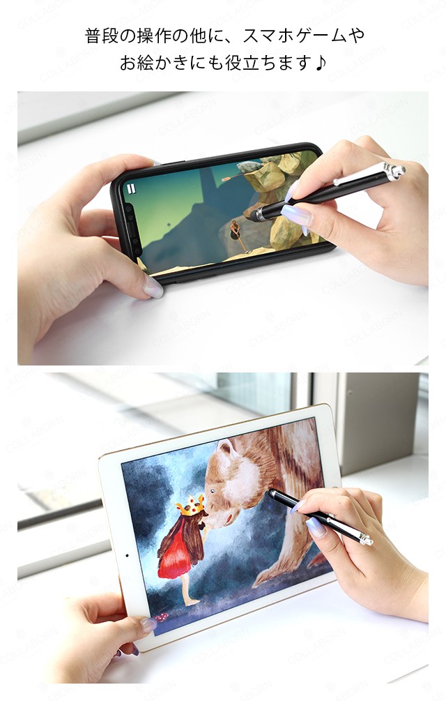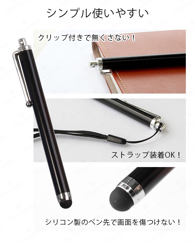 商品仕様■対応機種:iPhone、iPad、スマートフォン、タブレット各種■対応タッチパネル方式:静電容量方式※筆圧機能は対応しておりません。■材質:アルミニウム、プラスチック、シリコン■サイズ (本体):L 113mm (長さ) × Φ 9mm (直径)■重量 (本体):3g■保証期間 :初期不良のみ交換対応特徴ペンクリップ付き、ストラップ用の穴付き画面に傷つかない柔らかいゴム(シリコン)タイプです。超軽量でクリップが付いているためポケットや本、ダイアリーなどに留めることができます。冬に手袋を脱がなくてもスマホを利用することもできます。