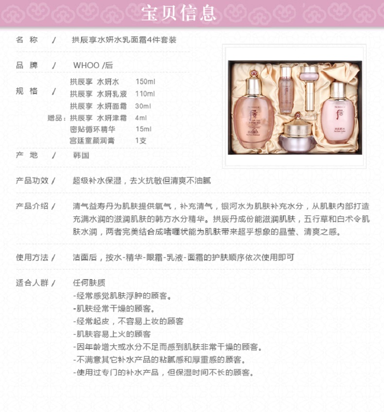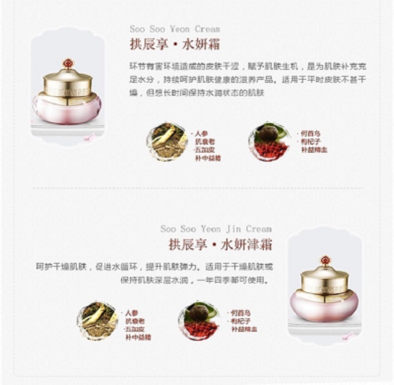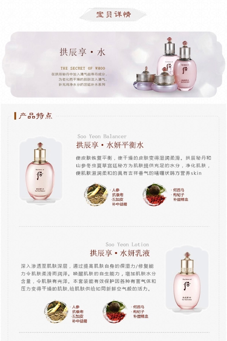 Main Product: Gongjinhyang Soo Soo Yeon Balancer 150ml, Soo Yeon Lotion 110ml, Soo Yeon Cream 30ml / Gift: Bichup Soonhwan Essence 15ml, Soo Yeon Jin Cream 4ml, Soo Yeon Moisture Pack 13ml