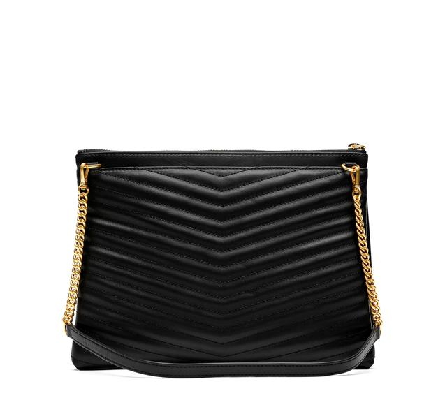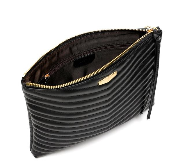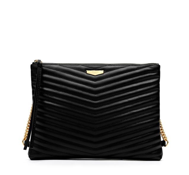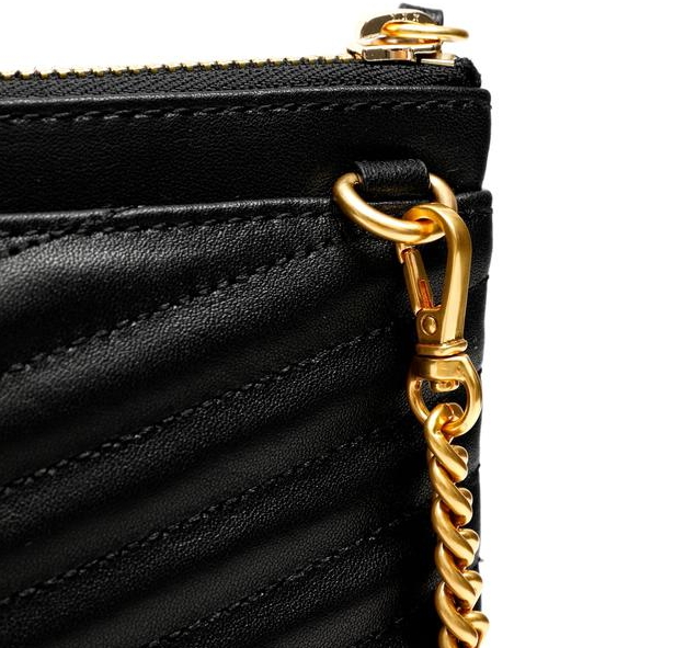블랙 컬러 바탕에 V패턴 퀼팅과 체인으로 포인트를 준 클러치 입니다.