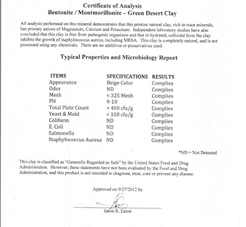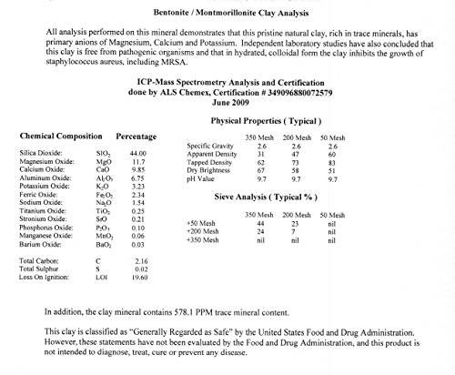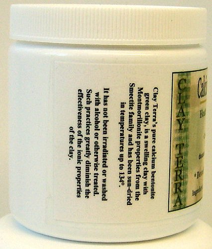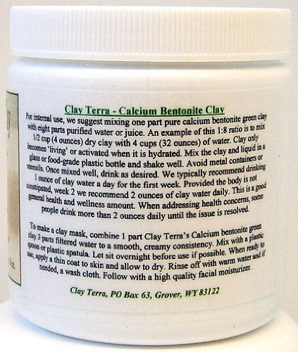 -. Binding : Health and Beauty -. Brand : Clay Terra -. EAN : 0640791794025 -. Feature : Pure Calcium Bentonite Clay / Clay Terra's pure calcium bentonite clay can be used internally and/or externally. / Calcium bentonite clay has been used for health, wellness and beauty for thousands of years / 9.7pH Clay Terra, a unique and rare, green swelling calcium Bentonite clay with Montmorillonite properties from the Smectite family of clays / finest powered drinking clay you can find 320 or better -. IsAdultProduct : 0 -. Label : Clay Terra -. Manufacturer : Clay Terra -. MPN : Cla-1805 -. NumberOfItems : 37 -. PackageQuantity : 1 -. PartNumber : Cla-1805 -. ProductGroup : Beauty -. ProductTypeName : BEAUTY -. Publisher : Clay Terra -. Studio : Clay Terra -. Title : Clay Terra - Calcium Bentonite Clay - 8 oz. food grade Montmorillonite clay, green clay -. UPC : 640791794025